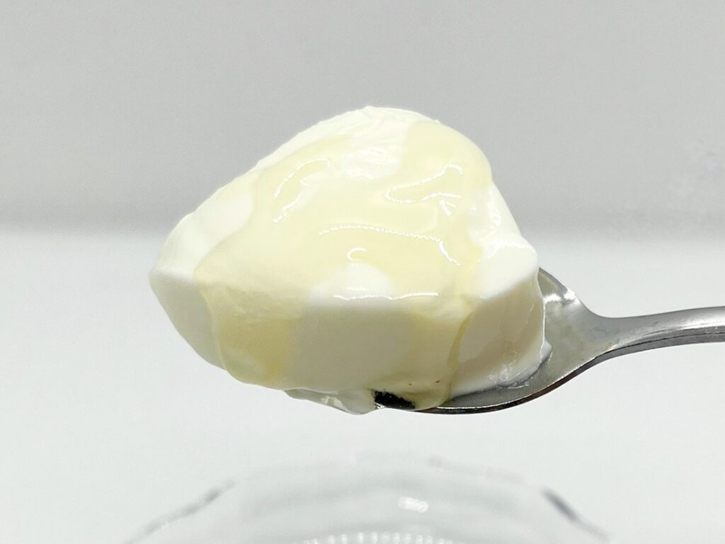 食べてみると、まるでクリームチーズかグリークヨーグルトのよう。とにかく濃い!酸味もありますが、プレーンヨーグルトなのに奥深い甘みも感じます。これは美味しい~。チーズのような濃密な食感で食べ応えがありながらも、なめらかでクリーミーさもあります。