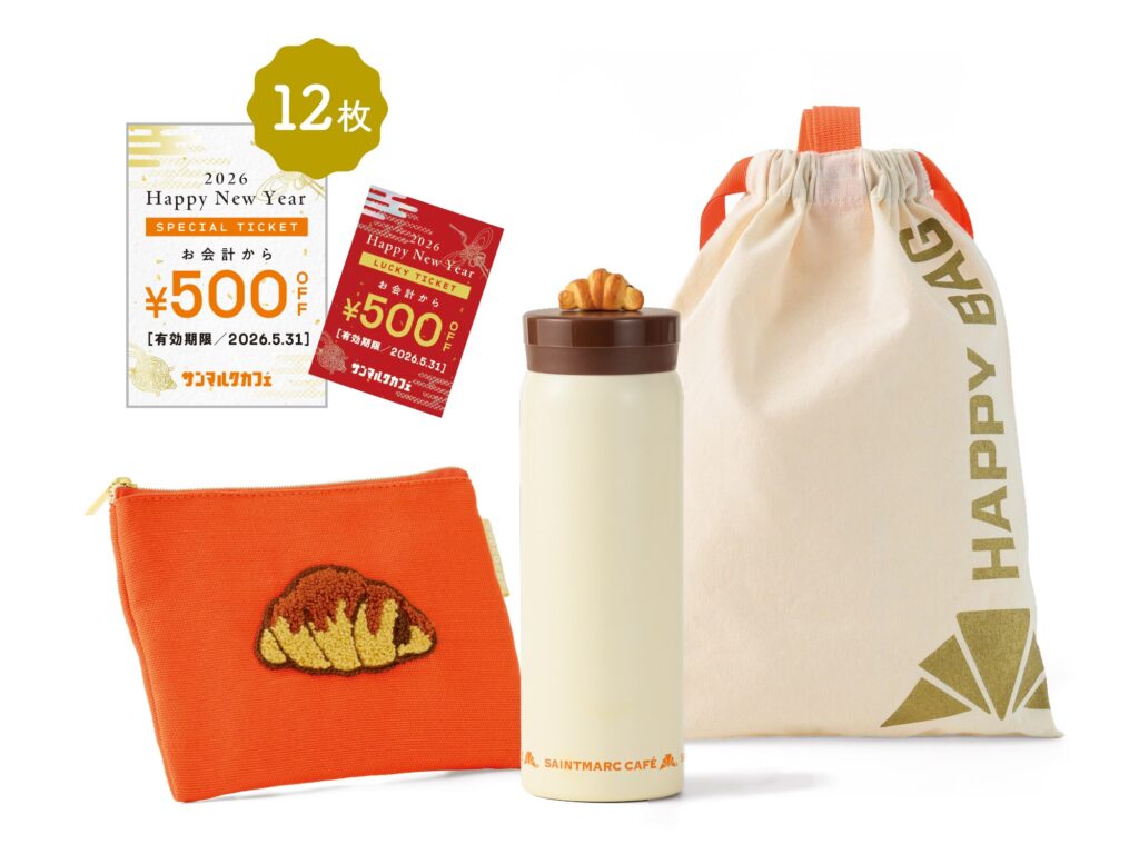 最後にご紹介するのは、サンマルクカフェの福袋です。販売は2025年12月26日(金)より店舗にてスタート。看板商品である「チョコクロ」がモチーフとなったタンブラーやポーチなどのオリジナルアイテムや、定番商品をお得に楽しむことができる福袋全4種が展開されます。