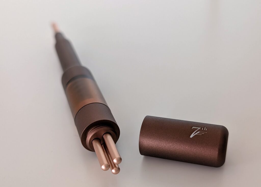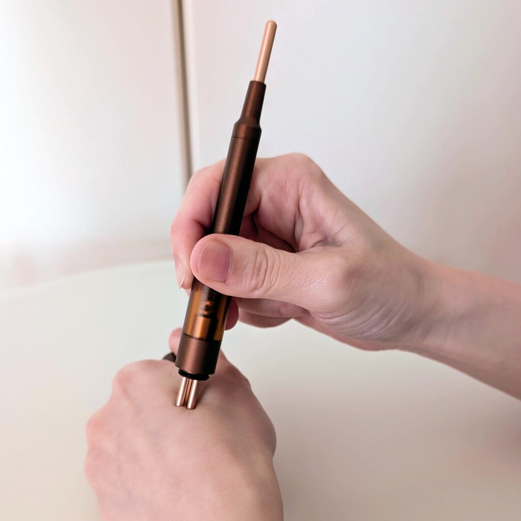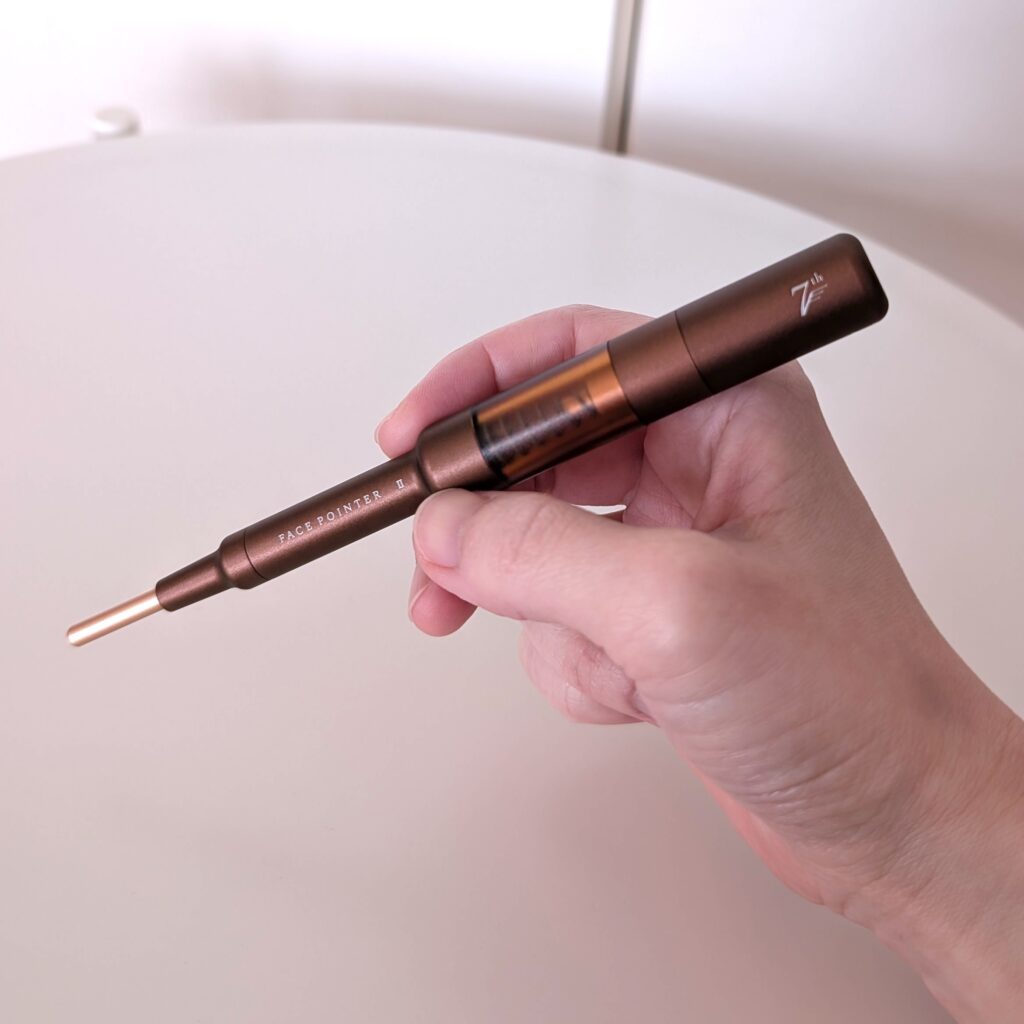 『フェイスポインター』には、シングルロッドとトリプルロッドの2種類の先端があり、部位や目的によって使い分けが可能です。シングルロッドは1点でピンポイントに刺激できるため、エラやほうれい線周りなど、コリを強く感じる部分や深部までしっかりアプローチしたいときに向いています。
