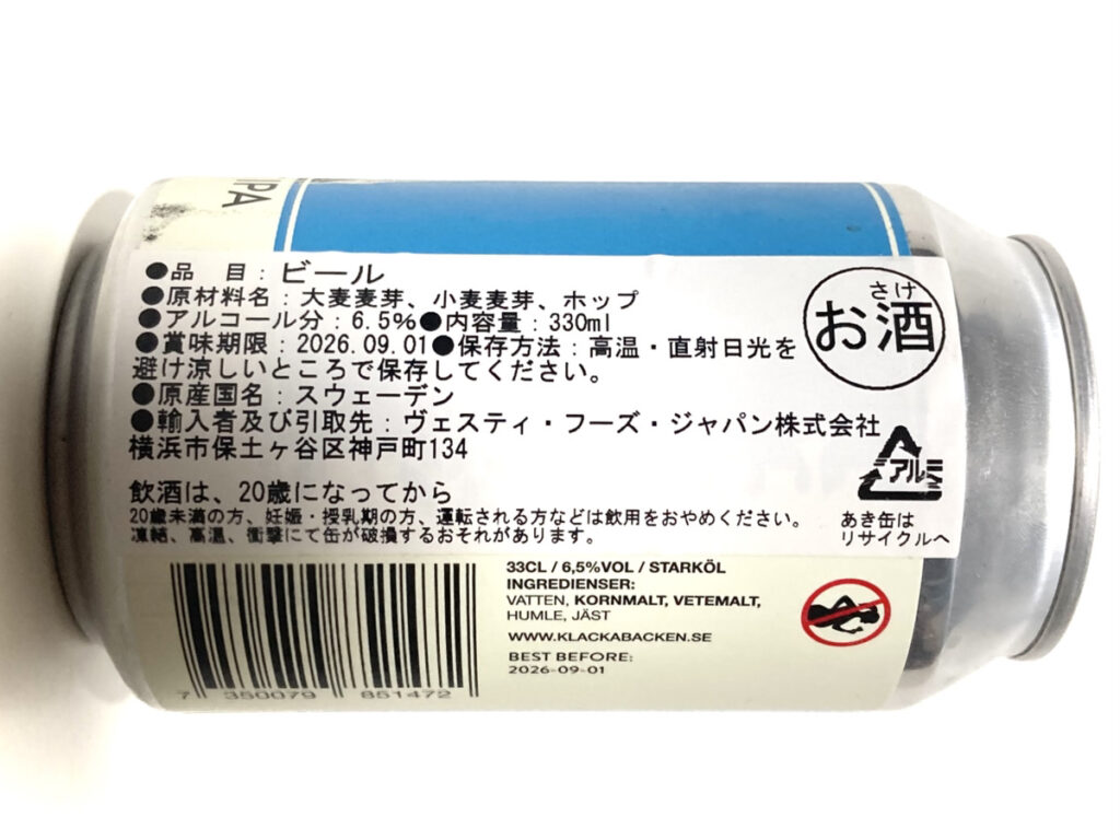 こちらがゲットした、スウェーデンのブルワリーKlackabackenの「ELIN」。スタイルは、ホップの苦みと強いアロマが特徴のWEST COAST IPAです。499円(税込)で購入しました。