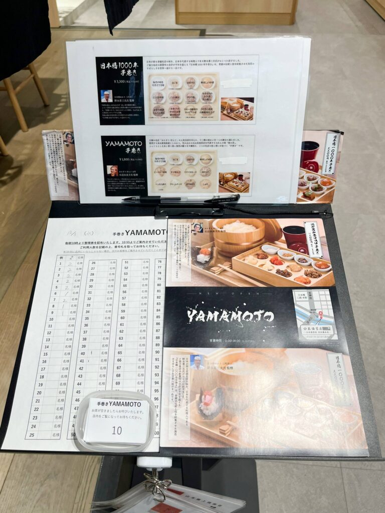 今回は11月4日(火)のオープンより話題沸騰中のお店「手巻き YAMAMOTO」をご紹介しました。「山本海苔店」は10時よりオープンしていますが、「手巻き YAMAMOTO」は11時より開店。整理券は10時から配布されます。休日のランチタイムには3時間ほどの待ちになることもあるそうなので、時間に余裕を持って訪問してくださいね。