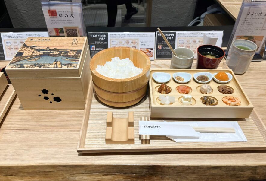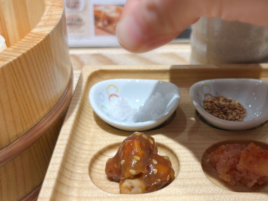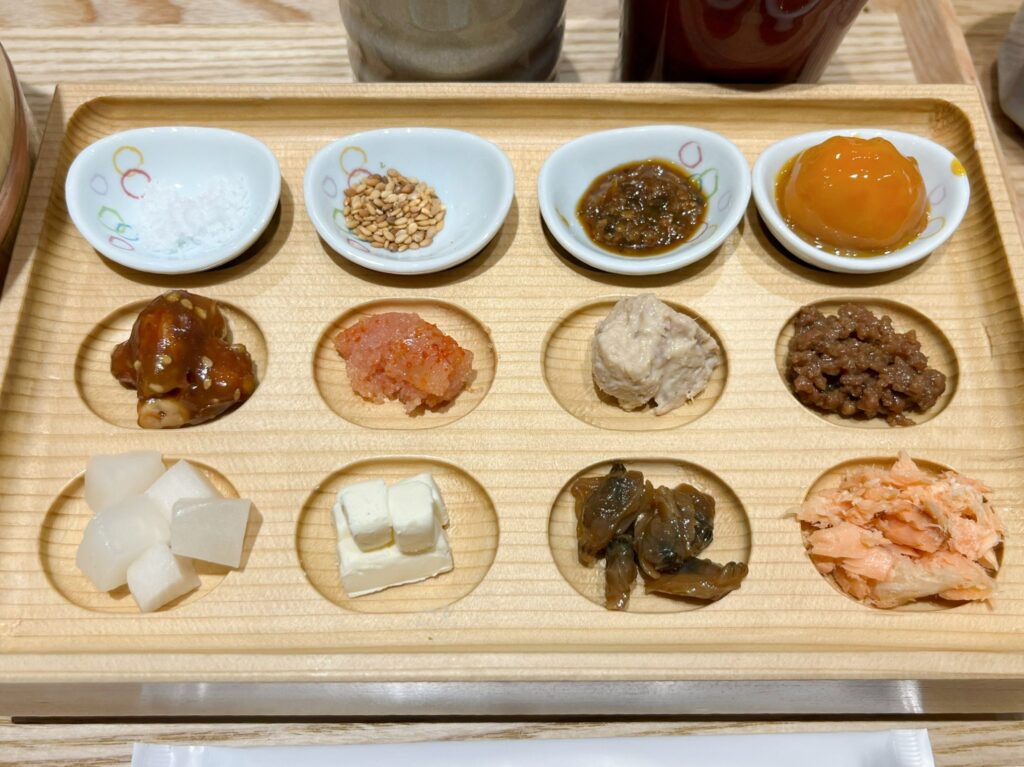 見てください!このたくさんの具材。日本橋で作られた“べったら漬け” をはじめ、“しゃけ”、“辛子明太子”など、ご飯のお供として代表的なものや、“クリームチーズ”、“ピーナッツ味噌”“、山形県の郷土料理“ままけは”など珍しいものが並びます。これらの具材も、使用している新潟産のお米も「ぼんご」の女将さんが厳選したものなんだとか。