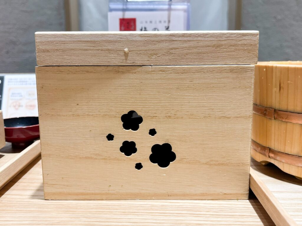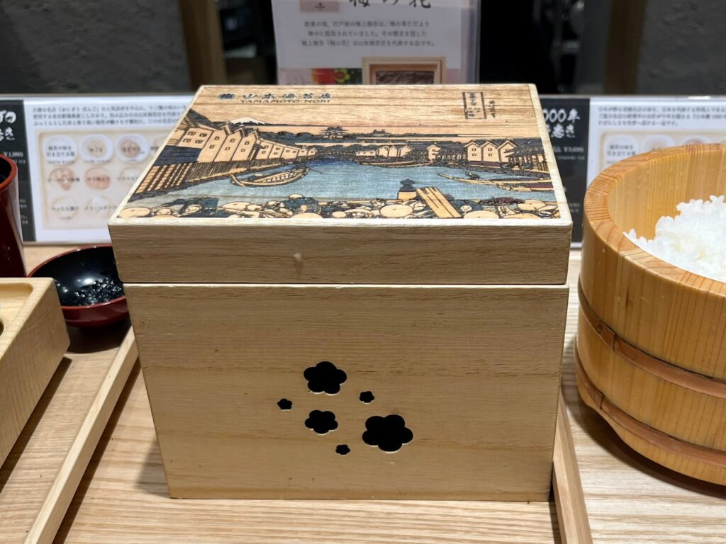 提供される前に192度の高温で焼かれた海苔『梅の花』は、この木箱に四切8枚入っています。箱の下には炭が入っておりパリパリの状態をキープしています。なんて至れり尽くせりなんでしょうか。