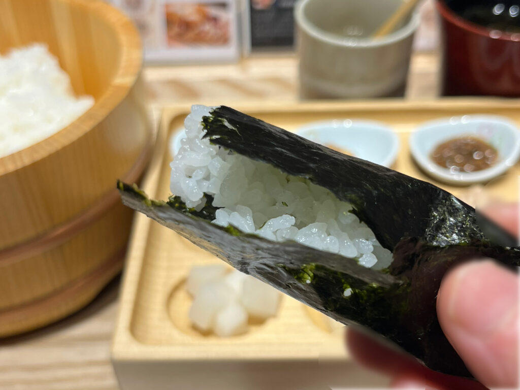 口に入れた途端、豊かな海苔の風味がいっぱいに広がって、あとから来るお米の甘さ、旨みがたまりません!塩が双方の味わいを引き立てていて、これだけで十分な美味しさです。