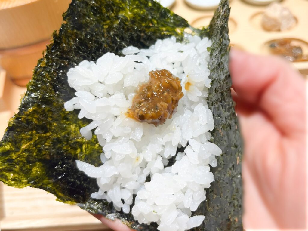 初めて食べた“ままけは”。山形県のご飯のお供で、米麹や醤油、青唐辛子、瓜、昆布などを混ぜて作られた甘辛い漬物とのこと。単体で食べると辛かったのですが、手巻きにすると最高!どんどんご飯が進んでしまう味でした。