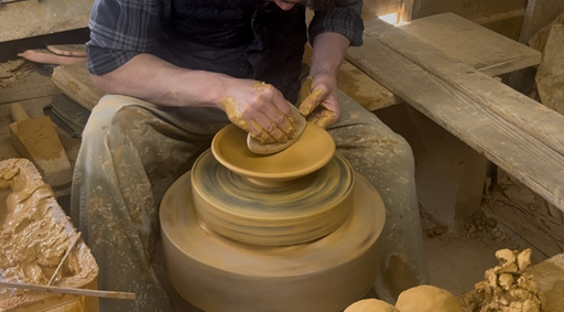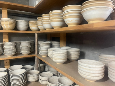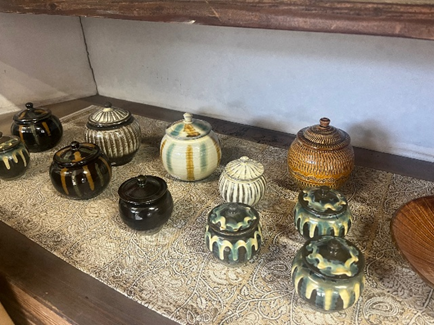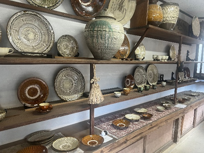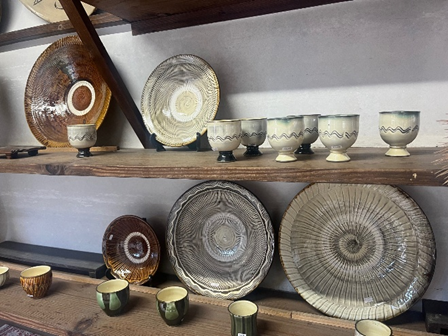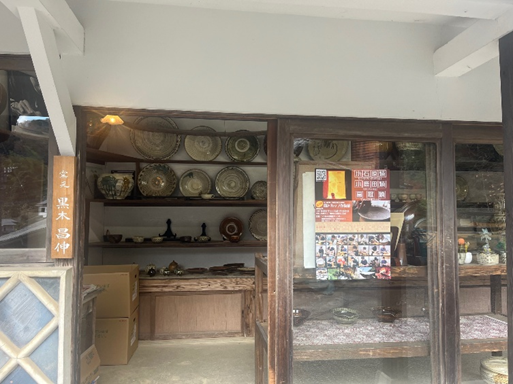 小鹿田焼の里は、大分県日田市内から車で約20分の山あいにあります。伺った黒木昌伸さんの工房では、小鹿田焼を販売している店舗の横に作業場があり、窯に入れる前の器が並んでいる奥で黒木さんが実際にろくろを回していました。