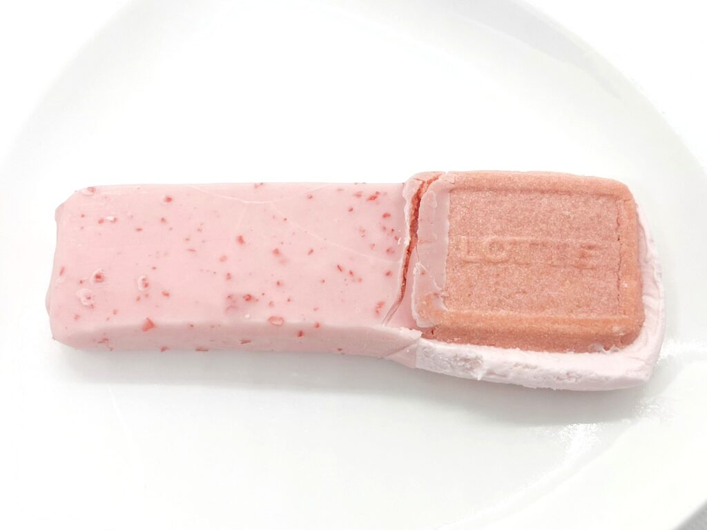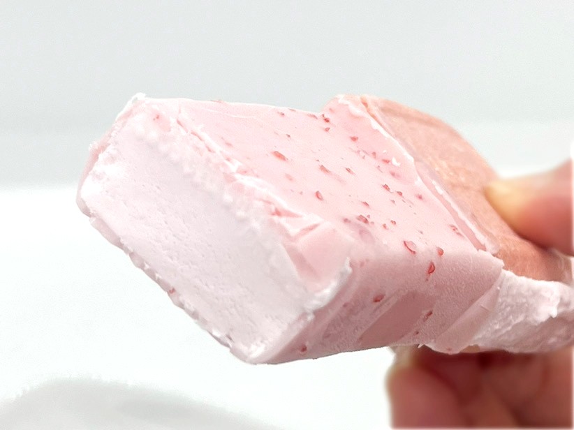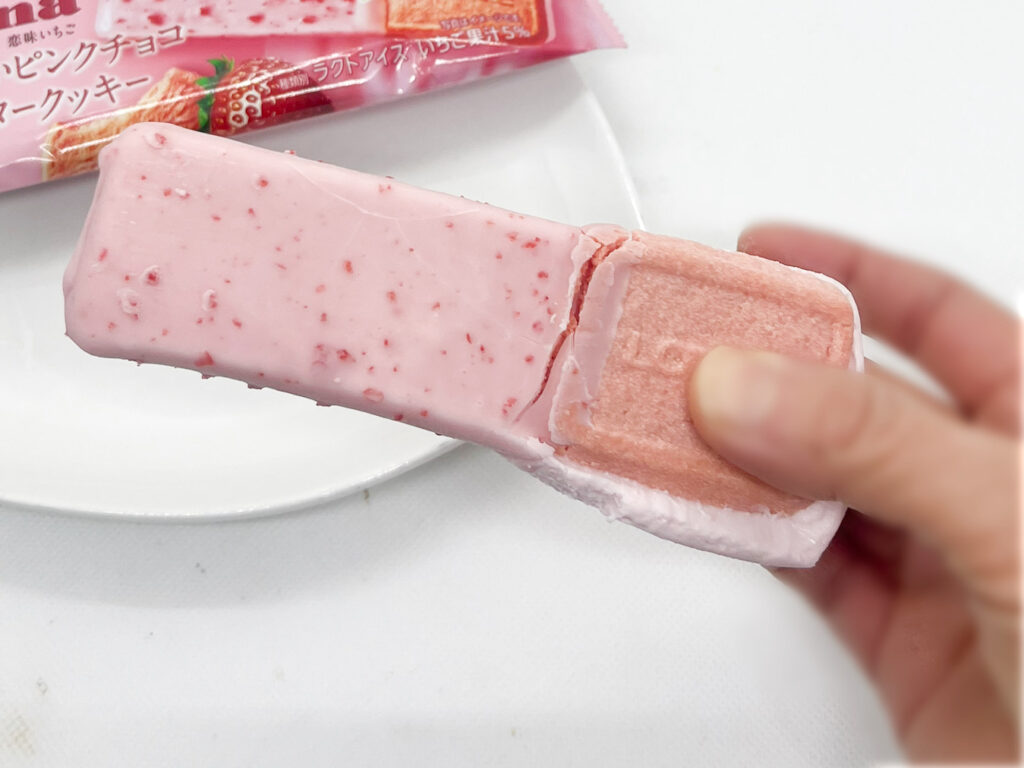 まずはチョコレート側からいただきます。チョコレートのパリっとした食感とアイスのなめらかな口どけがたまらな~い!イチゴの甘酸っぱさ、ミルキーなコク、チョコレートの濃厚な甘さはとてもバランスがよく、贅沢な味わいに仕上がっています。