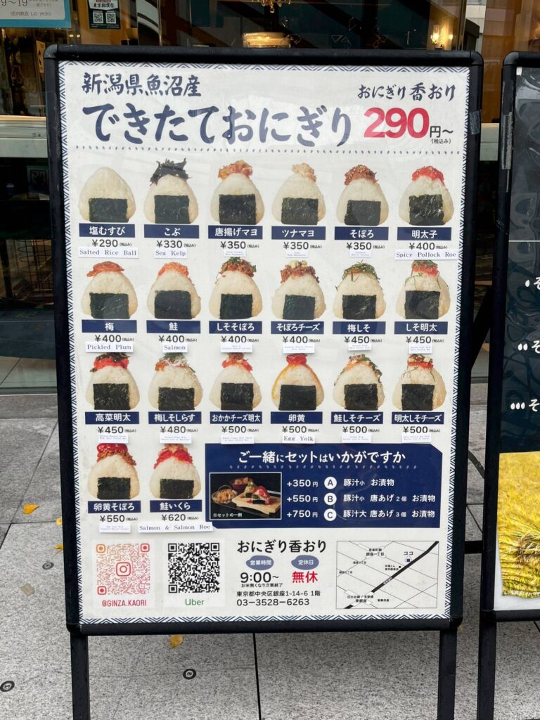 店頭に出された看板には、美味しそうなおにぎりがたくさん並んでいます。