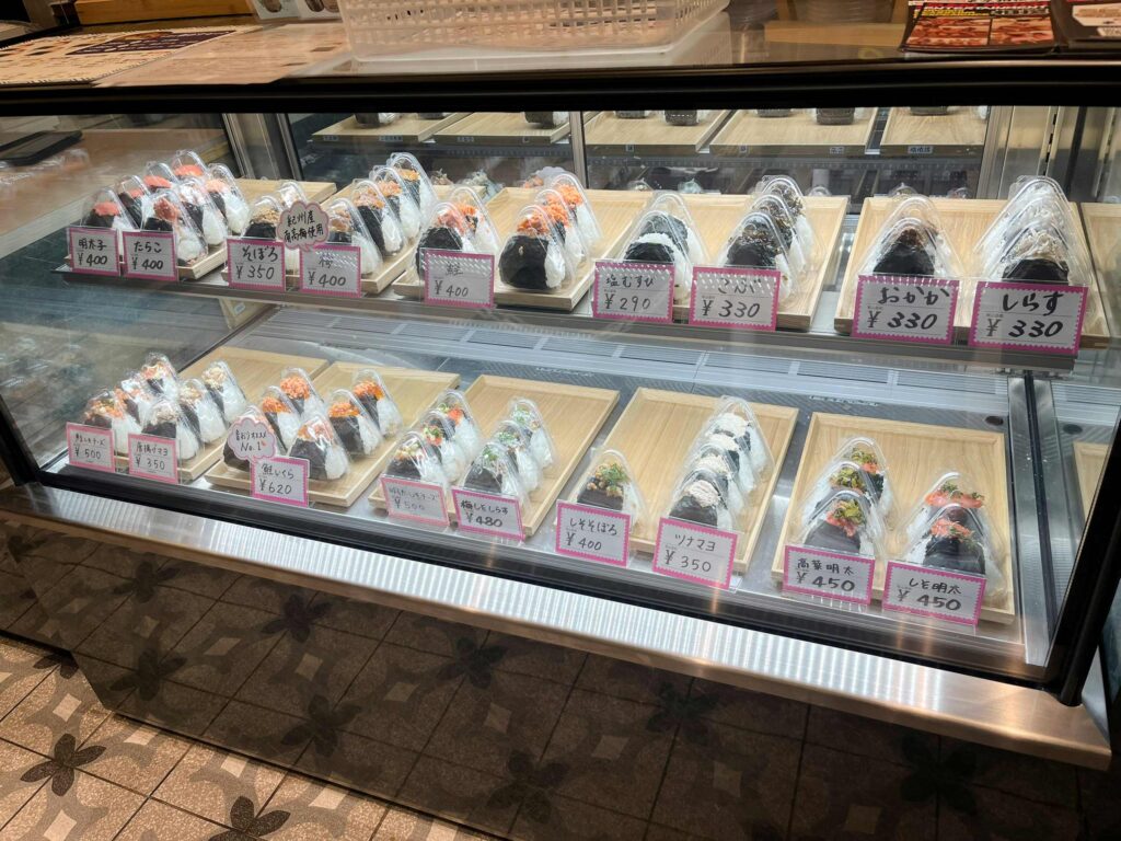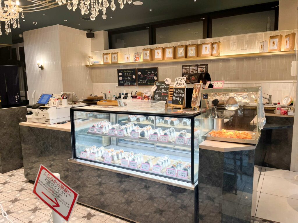 ショーケース横のレジで注文をします。ショーケースにはすぐにテイクアウトできるように、おにぎりが並んでいます。