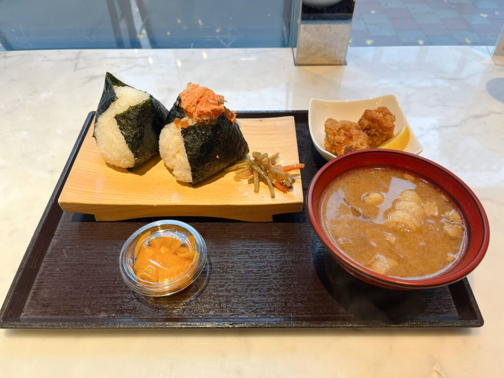 どのおにぎりにしようか迷いに迷いましたが、注文したのは、『鮭といくらの親子』(税込620円)、『塩むすび』(税込290円)、豚汁(小)と唐揚げ(2個)、漬物が付いてくる『Bセット』(税込550円)です。