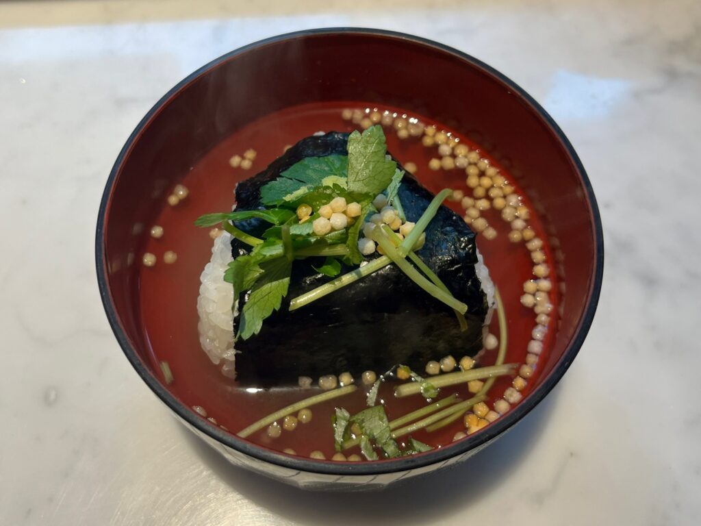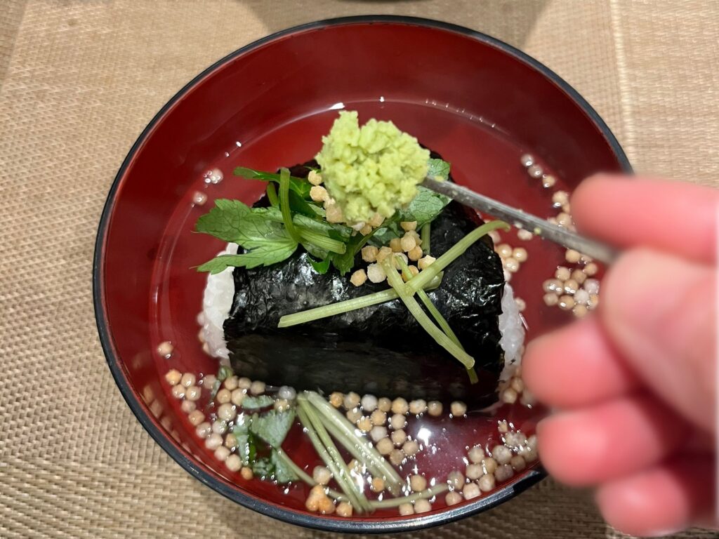 ではさっそく、『塩むすび』をお茶漬けに。お出汁のほかに、あられや三つ葉、わさびのトッピングもできるんですよ。自分の好みで調節できるのが嬉しい!