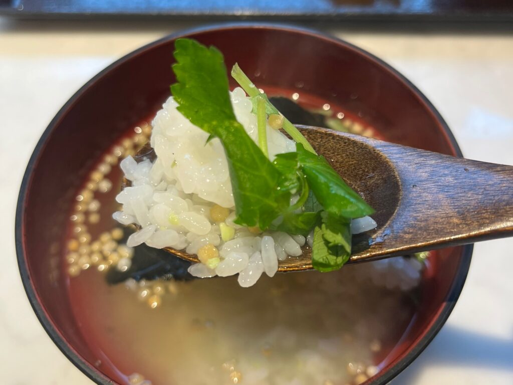 優しいお出汁の風味がご飯の旨み、海苔の味わいを引き立ててくれました。セットで付いてきた漬物を入れるとまた違った味を楽しむことができますよ。