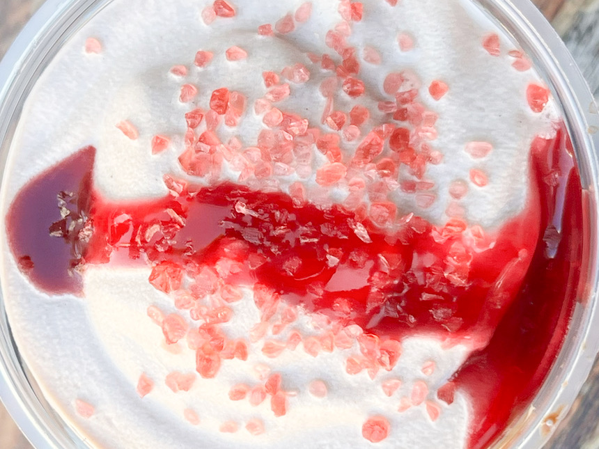 こちらが『カカオ & ストロベリー ムース フラペチーノ®』。Tallサイズのみで、テイクアウトは税込717円、イートインの場合は税込730円です。こちらの商品は、カスタマイズで『エスプレッソショット』(テイクアウト/税込54円、イートイン/税込55円)を追加するのが特におすすめとのことで、そちらも注文してみました。