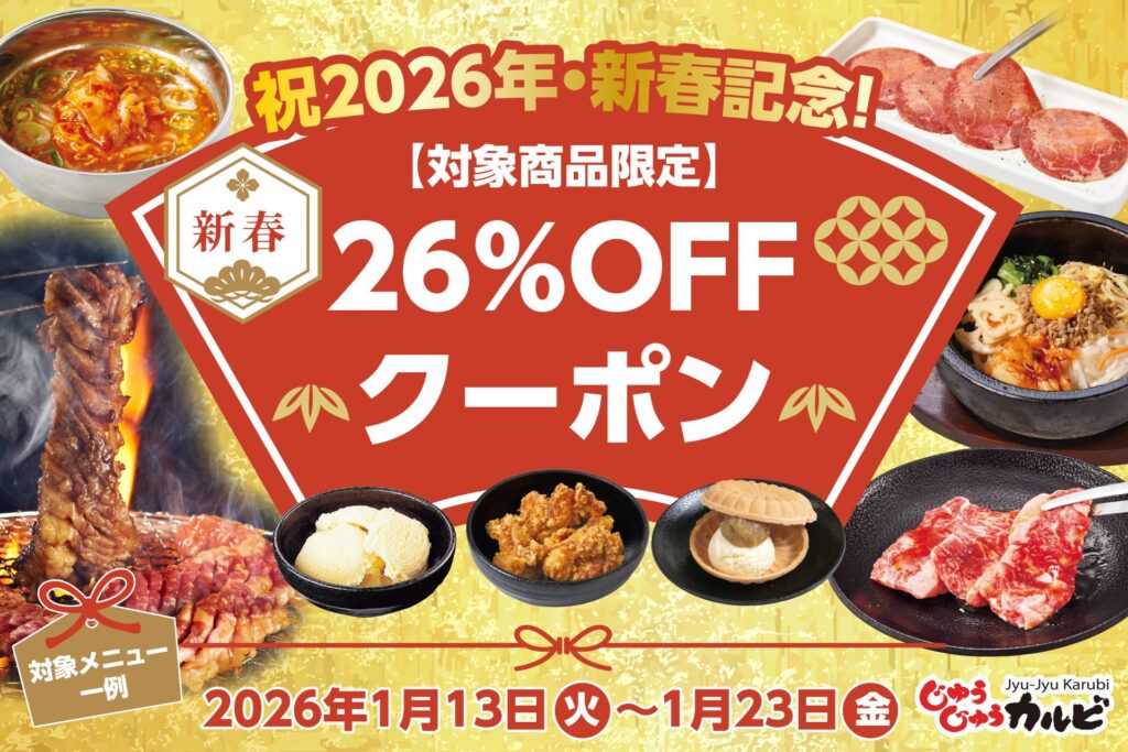 2026年1月13日(火)~23日(金)の10日間で開催されるのは、熟成肉が自慢の【じゅうじゅうカルビ】、新春セール。じゅうじゅうカルビ公式アプリのクーポンを利用することで、人気の12商品が26%OFFで注文することができます!