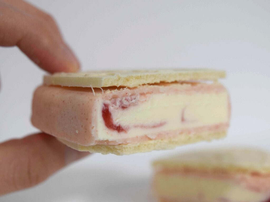 こちらがアイス本体。いちごコーティングで包まれた、果肉感たっぷりのいちごソース入りミルクアイスクリームが、ホワイトウエハースでサンドされているそう。春を予感させる華やかなビジュアルと、漂ってくるいちごの爽やかな香りに期待が高まります!