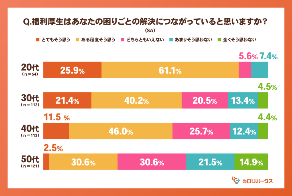次に、「働くうえで困っていることがある」と回答した人に対し、「福利厚生は困りごとの解決につながっているか」をたずねたところ、20代では約9割が肯定的に評価。