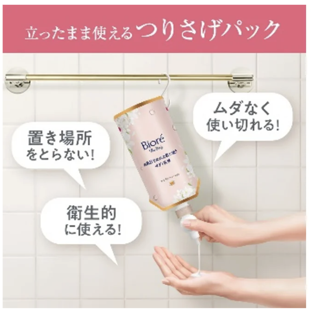 また、パッケージは吊り下げて使える“つりさげパック”仕様のため、立ったまま片手で使用可能。ボディケアが面倒で続かなかった人でも、習慣化しやすい工夫が施されています。顔にも使える弱酸性処方なので、全身まとめてケアしたい日にも便利。お風呂上がりのボディケアを時短したい方や、保湿を後回しにしがちな方にぴったりです。
