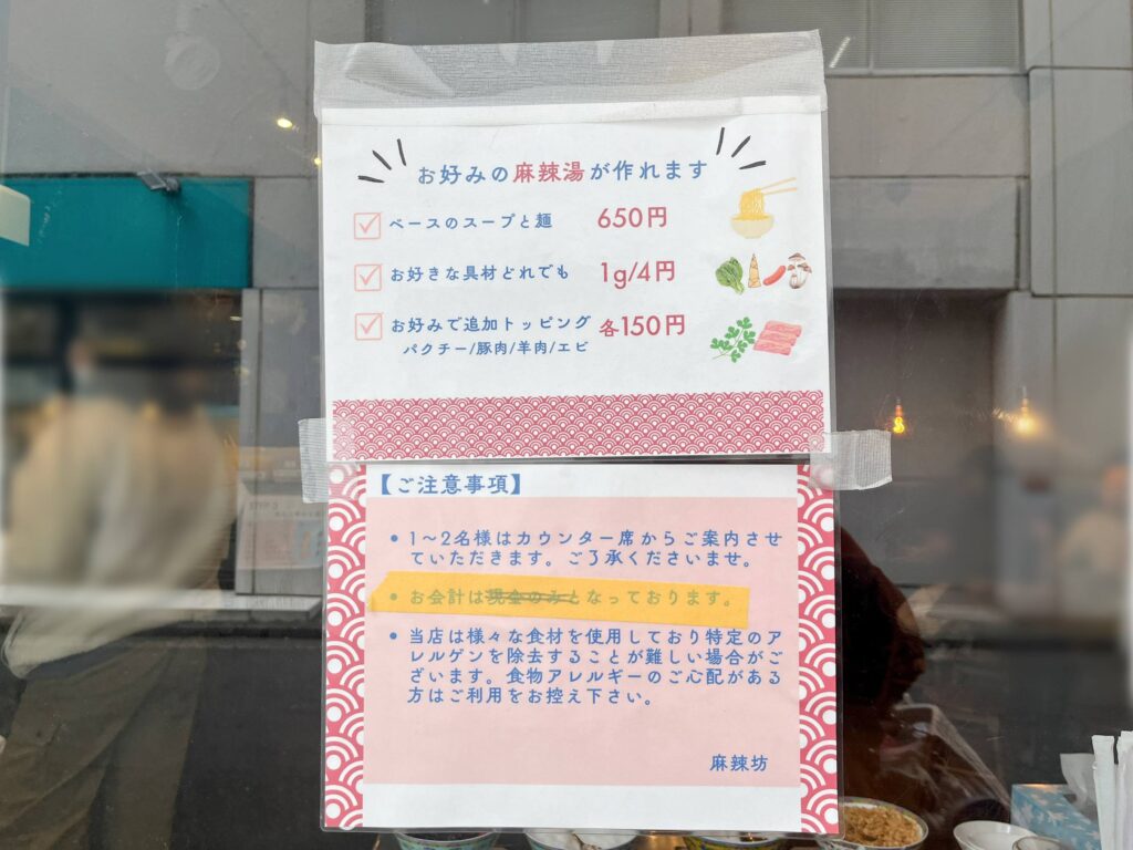 具材を選び終えたらレジへ。そこで、スープを<麻辣湯/麻辣拌(汁なし麻辣湯)>から選び、辛さは5段階(4以上は有料)、痺れは3段階から指定します。辛さのみ選べるお店が多い中、痺れまで調整できるのは、痺れ好きの筆者としては嬉しいポイント♪