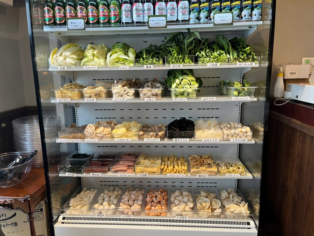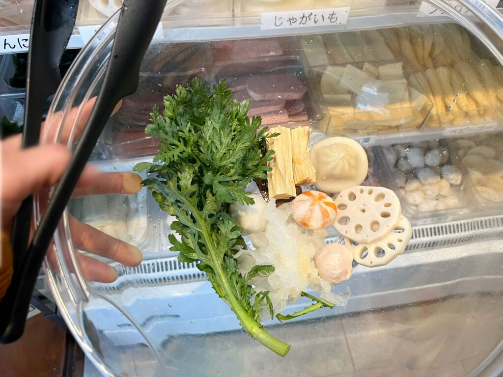 まずは、入り口すぐの棚から食材を選びます。棚の横にあるトングとボウルを使って取っていきます。今回は春菊、白きくらげ、レンコンなど気に入ったものをチョイス。