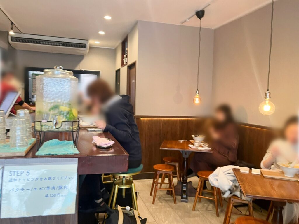 店内はカウンターが6席、4人掛けのテーブルが3卓設けられています。