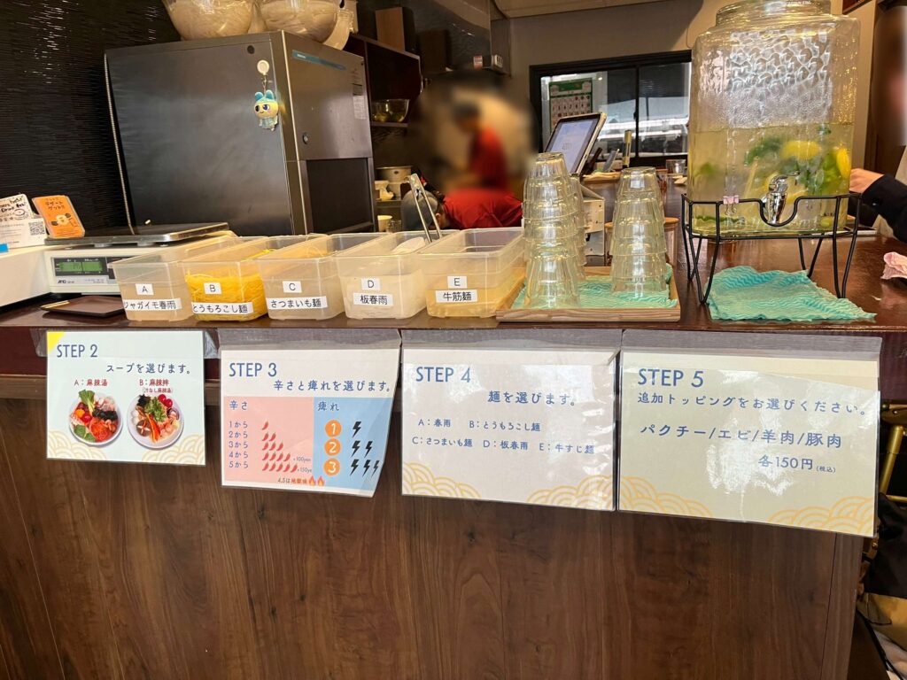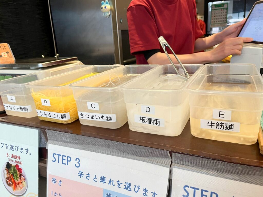 麺は5種類から選択でき、ミックスも可能です。最後に、豚肉や海老などのレジで選べる食材(プラス150円)を注文して完了!