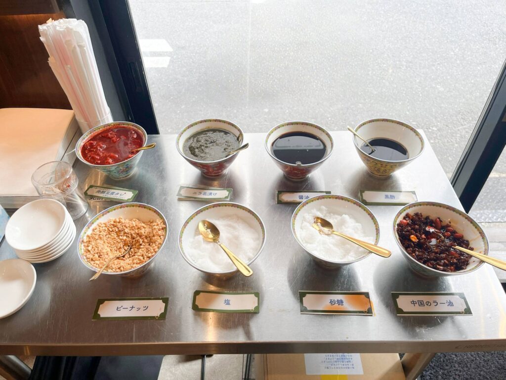 待っている間に調味料を取りに行きます。発酵豆腐タレやニラ花漬けなど見たことがない調味料があり、ワクワクしますね。