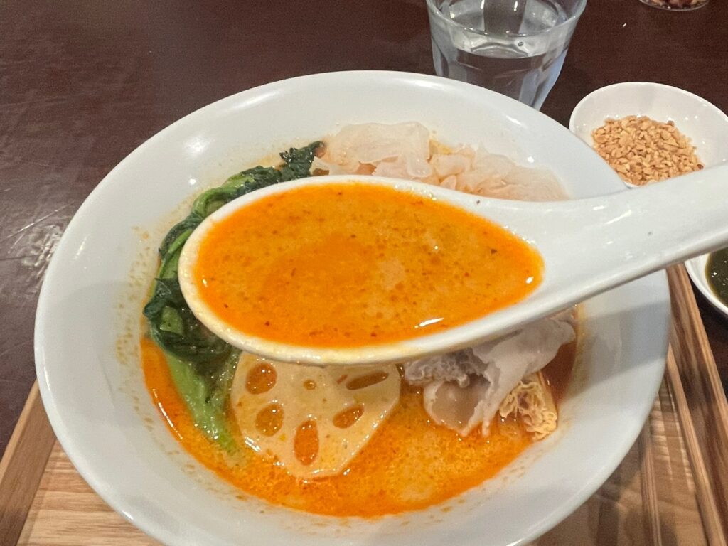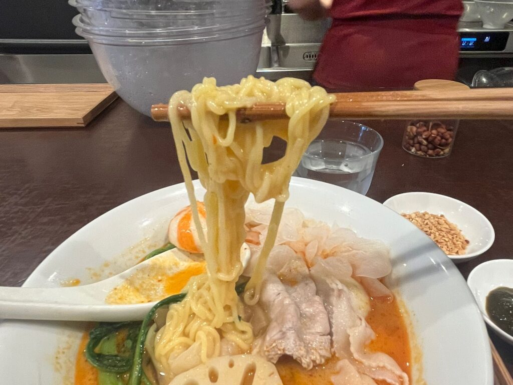 まずは、見るからに濃厚そうなスープからいただきます。ちょっとピリっとする辛さ、舌がビリビリする痺れ、鼻から抜けていく出汁の風味が美味しい!痺れ強めの辛さが好きな私としてはちょうどいい味わいになっていました。出汁は、国産の牛骨をベースに、豚骨や鶏がらを加えたスープ、さらに特製のゴマだれがコクをプラス。飲んだ瞬間に広がる奥深い旨みに驚いてしまいます。