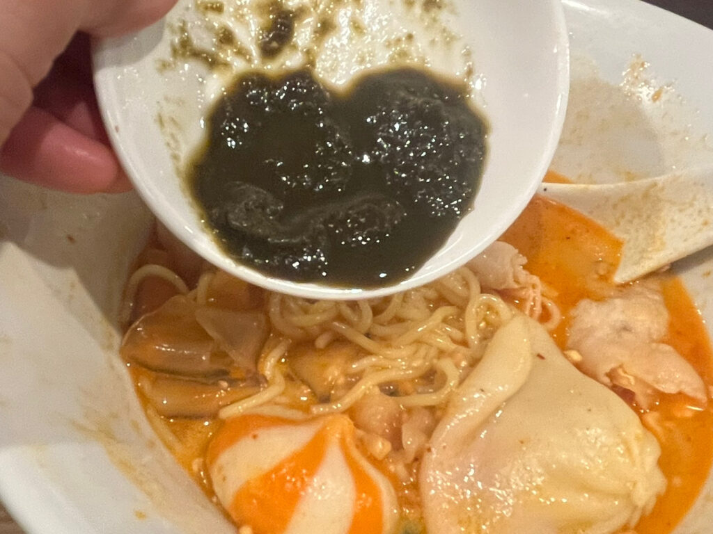 半分ほど食べたところで、調味料をイン!少しずついろいろと試してみましたが、一番気に入ったのは“ニラ花漬け”。ニラの臭みはなく、旨みを強く感じます。全体が華やかな印象になり、スープまで完食してしまいました。