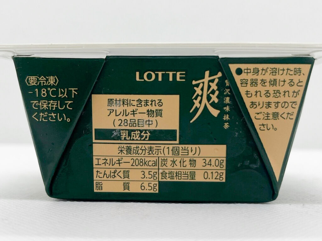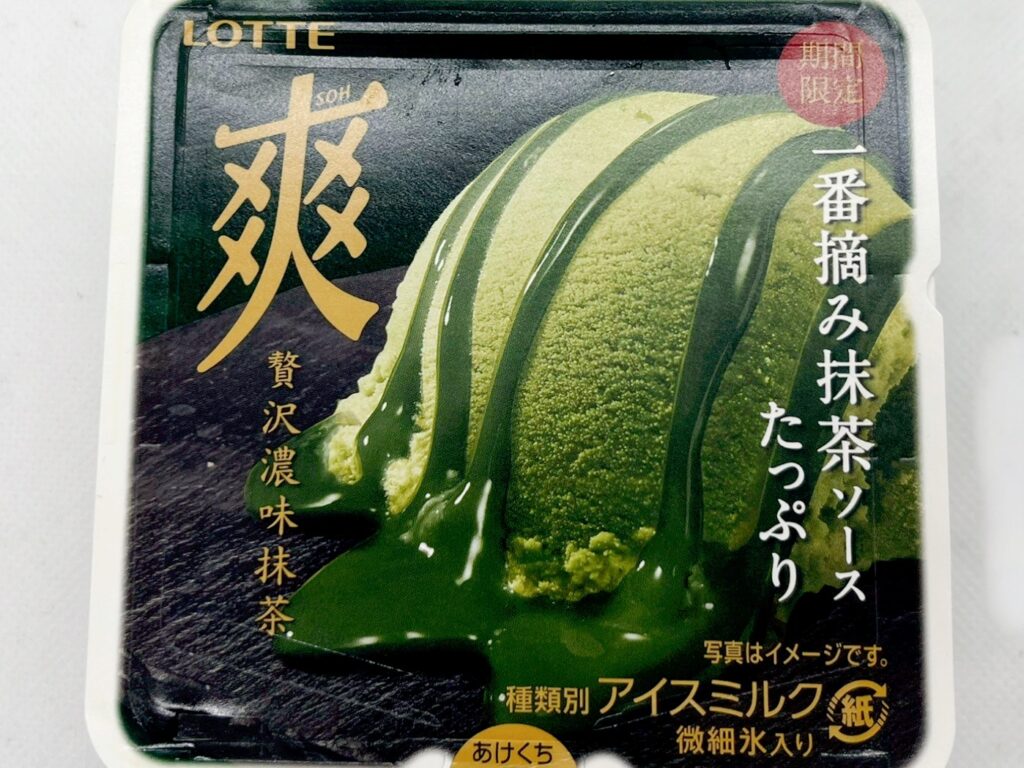パッケージは渋い色合いで、見るからに重厚な抹茶味を予感させます。通常の『爽』は“ラクトアイス”に分類されますが、贅沢シリーズは“アイスミルク”へグレードアップ。より濃厚で優雅な味わいに仕上げているそう。