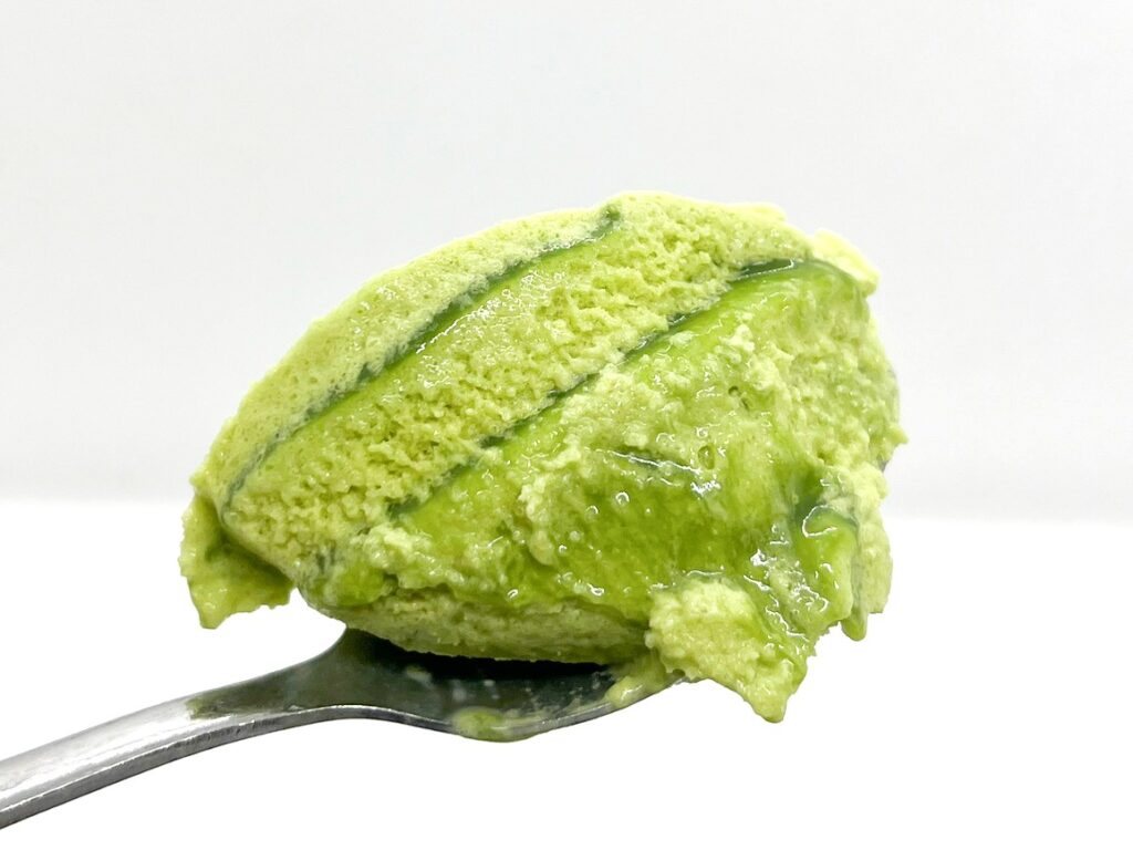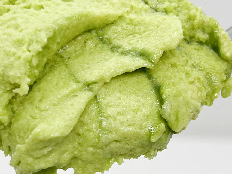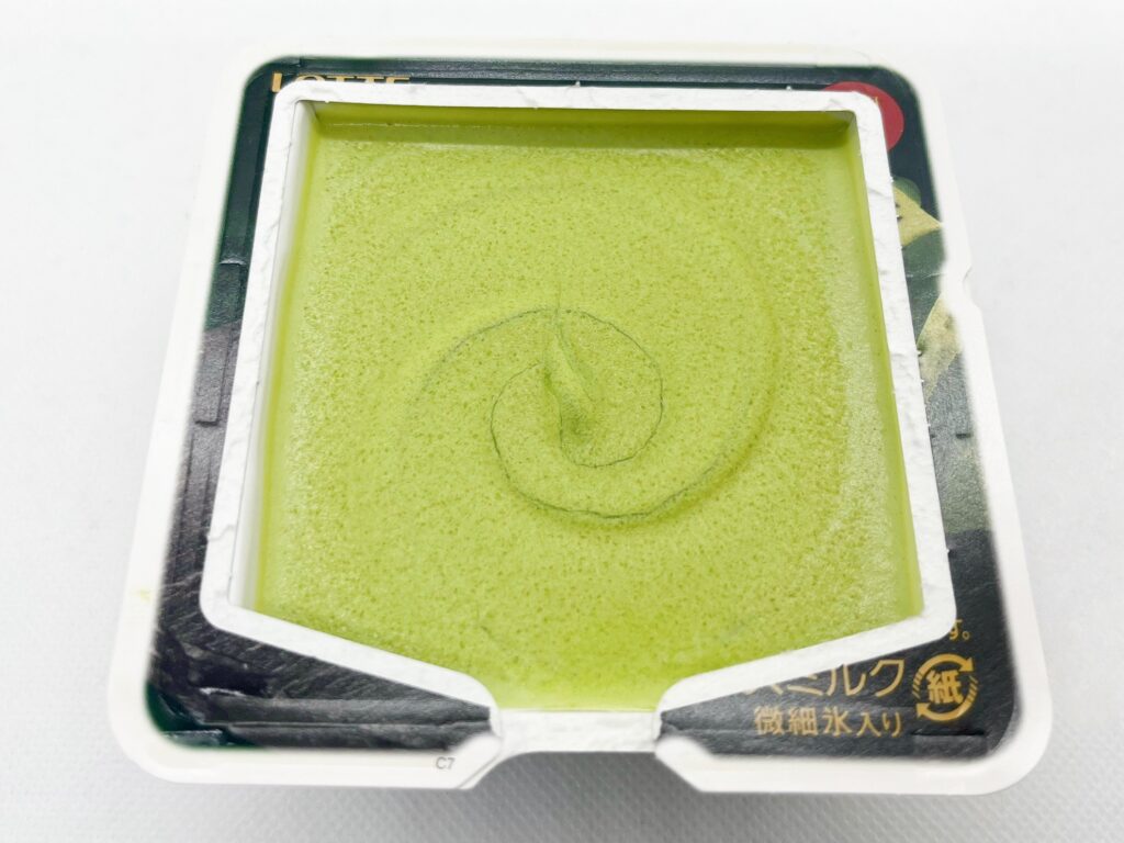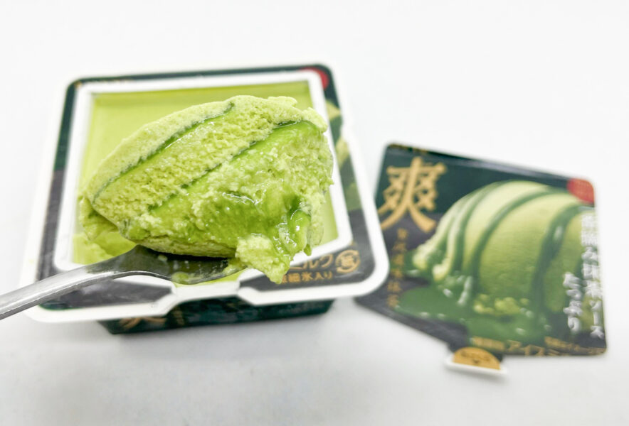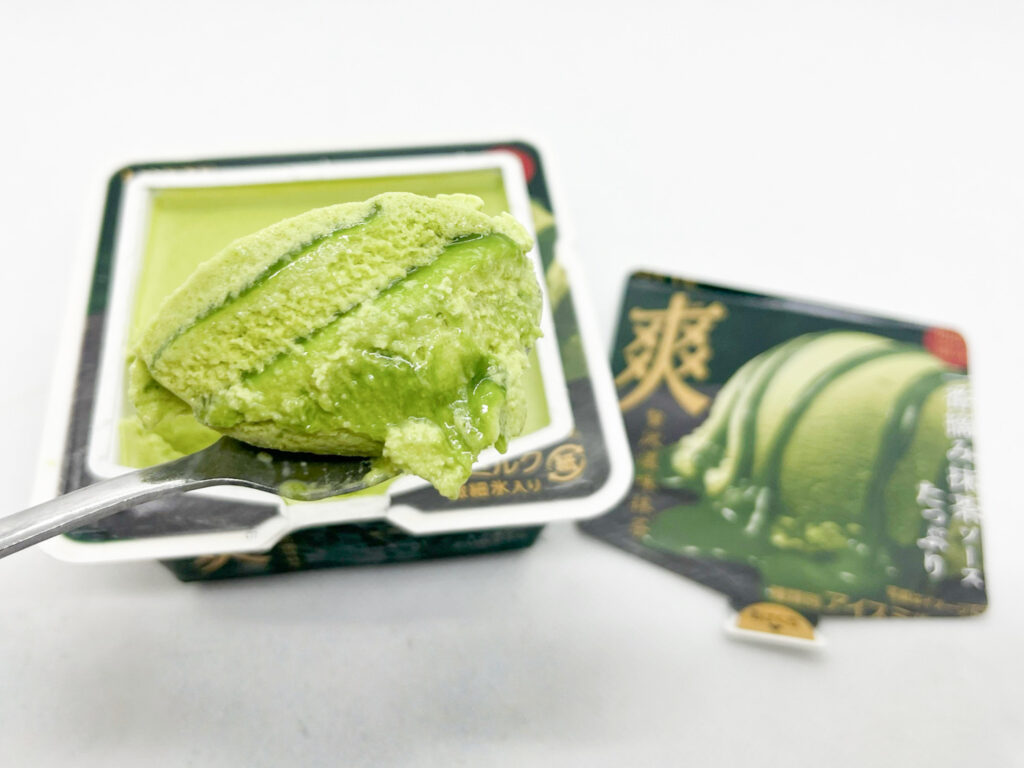 ではさっそくいただきます。口に入れた途端、鼻から抜ける抹茶の上品な香りにびっくり。抹茶の苦みがありながらも甘み、旨みもたっぷり。これは抹茶好きにはたまらない味わいです。また、爽ならではの微細氷が生み出す、心地よいくちどけ感もありつつ、アイスミルクらしいなめらかさ、濃密さも美味しい!