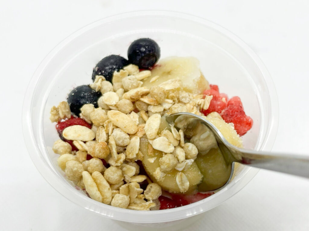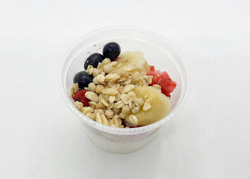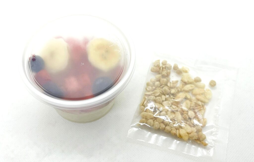 パッケージを外すと、フルーツとヨーグルトが入ったカップと、グラノーラの袋が。