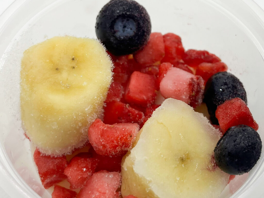 フタを開封!中には美味しそうなフローズンフルーツがたっぷり。こちらのバナナは、Doleが2021年から取り組んでいる“もったいないバナナ”というもの。まだ美味しく食べられるのに、流通過程の問題により捨てざるを得ないバナナを活用するプロジェクトです。