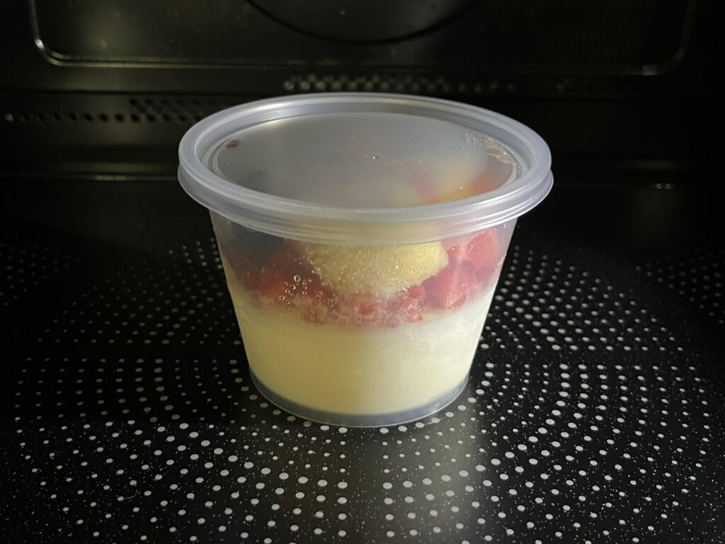 「Dole スムージーボウル」の食べ方は2種類あります。室温20度の部屋で20分置き自然解凍するか、電子レンジで加熱。今回は、時短できる電子レンジを使った方法を試します。