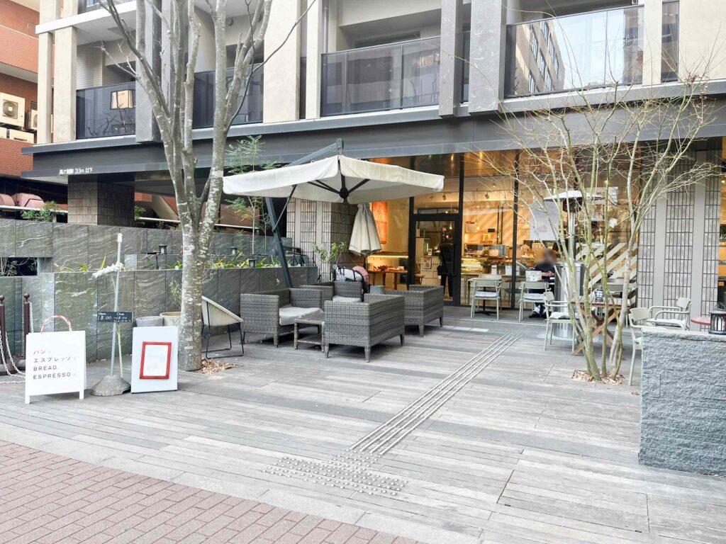場所は、JR田町駅から歩いて10分ほど。お店の前にはゆったりと過ごせそうなソファ席が設けられています。