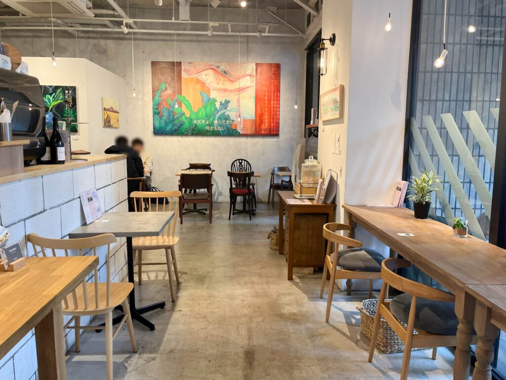 中にはいたるところにアート作品が。温かみを感じる木のテーブルや白壁の店内に、アート作品がよく馴染んでいて、まるでカフェと美術館が融合した世界のよう。