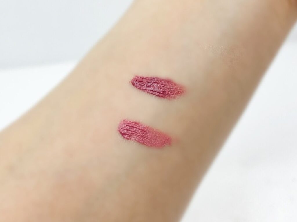 腕に塗ってティッシュで強くふき取ってみましたが、この密着力。でも“塗っている!”という重さはなく、自然にフィットしてくれます。マットな仕上がりが好みの方は大満足すること間違いなしのリップですよ。