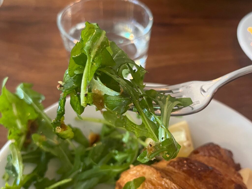 ルッコラがたっぷり使われたサラダは、オリーブオイルとコショウがよく効いたドレッシングが使われていて、ルッコラの風味とよく合います。レモンの酸味も相性バツグンでした。