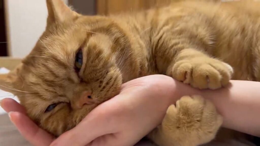 飼い主さんの手にかぶりついて、前足は手首をフミフミ……お顔はまるで「幸せだにゃ~」と言っているみたい♡