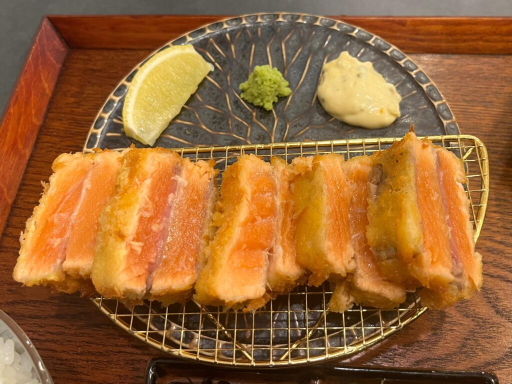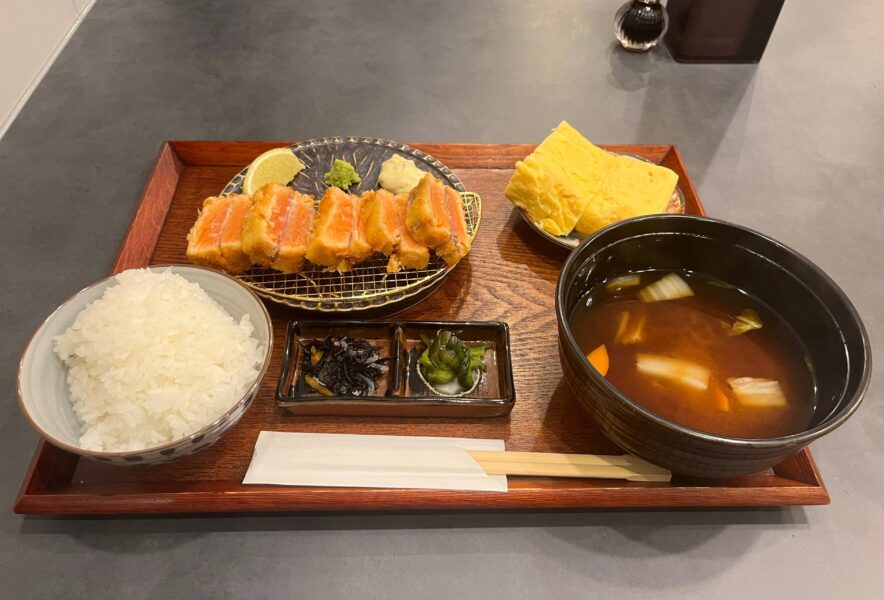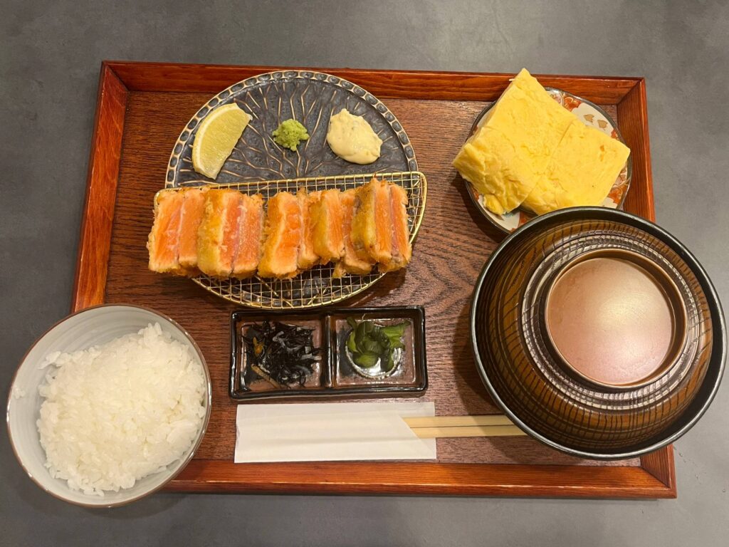 注文したのは『サーモンレアカツ定食』(税込2,150円)と『出汁巻き卵』(税込250円)。