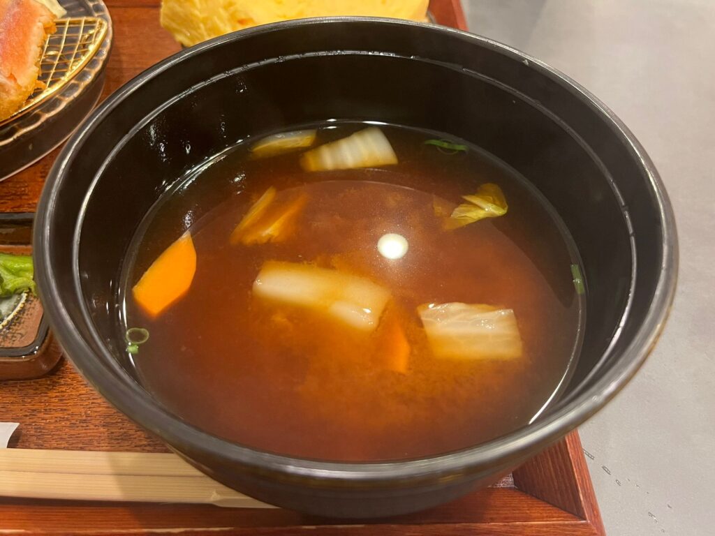 赤だしのお味噌汁は、白菜やニンジン、ネギ入り。赤だしの塩味でまたまたご飯が減っちゃいますよね~。