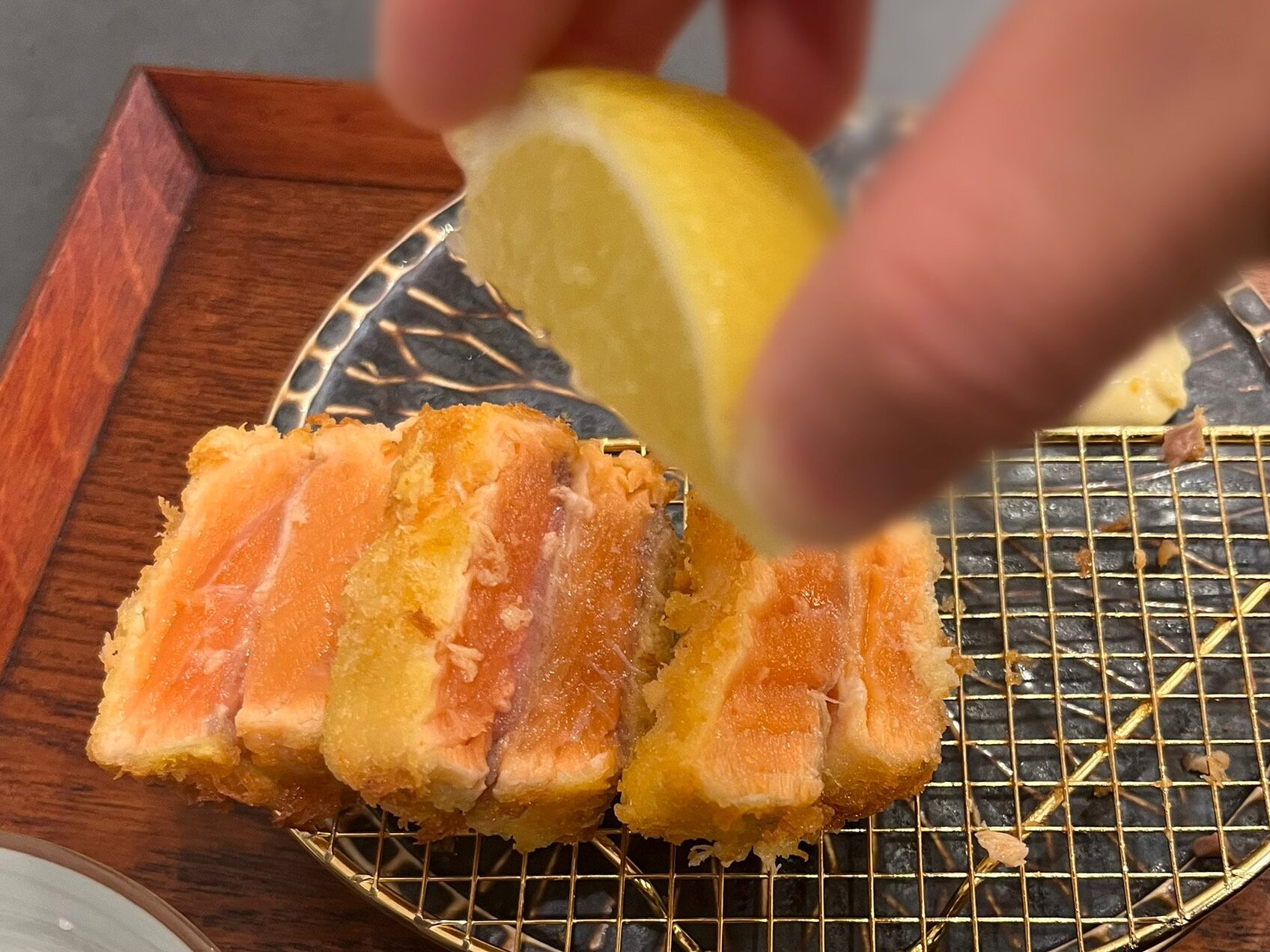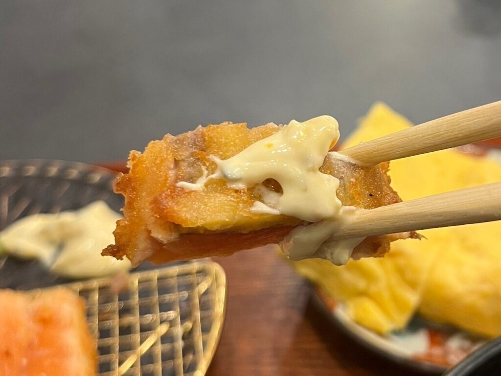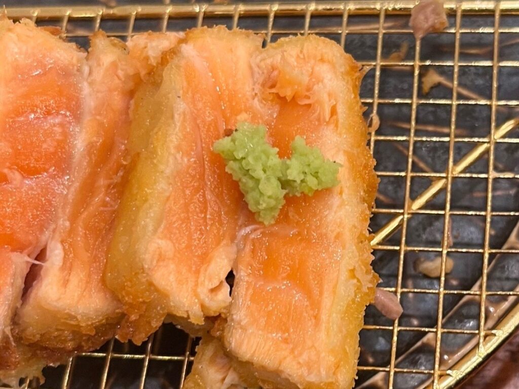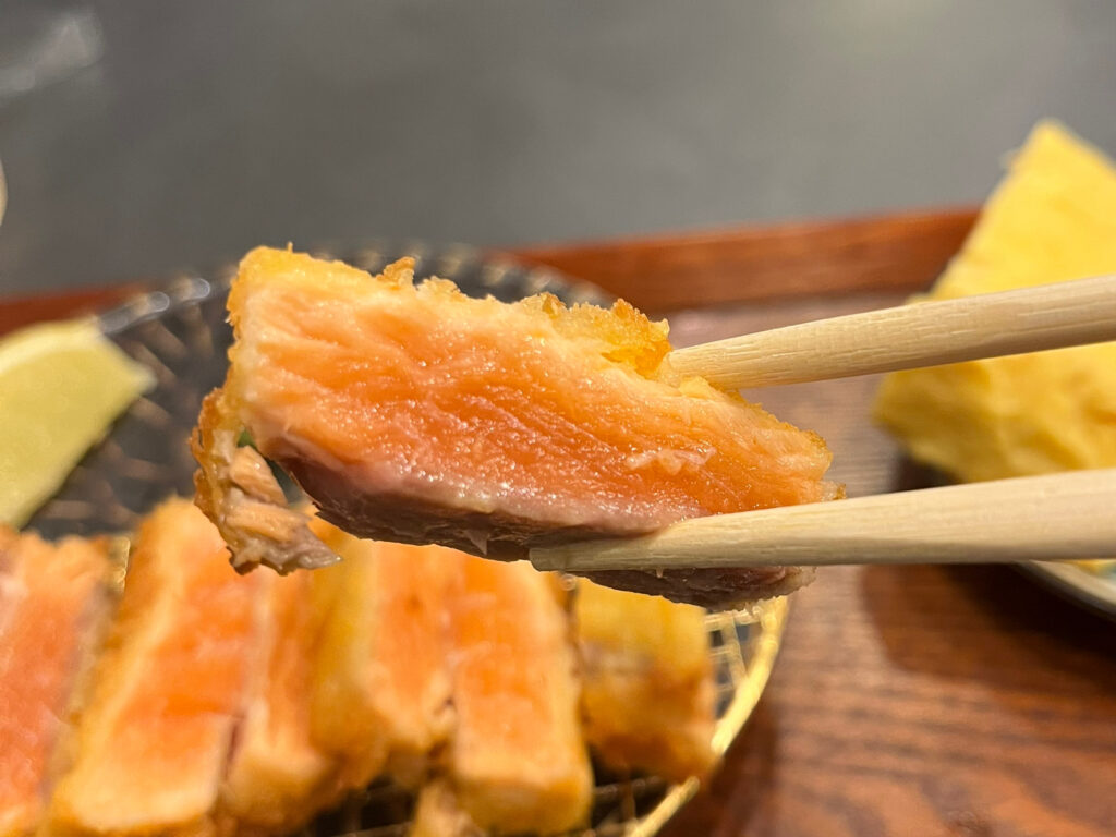 ではまず、サーモンレアカツをそのまま。中心部のレアなとろける旨み、衣の香ばしさのマリアージュが最高!そして、サーモンの旨みでご飯を一口。ご飯の甘みと旨みとの調和が美味しすぎる……。