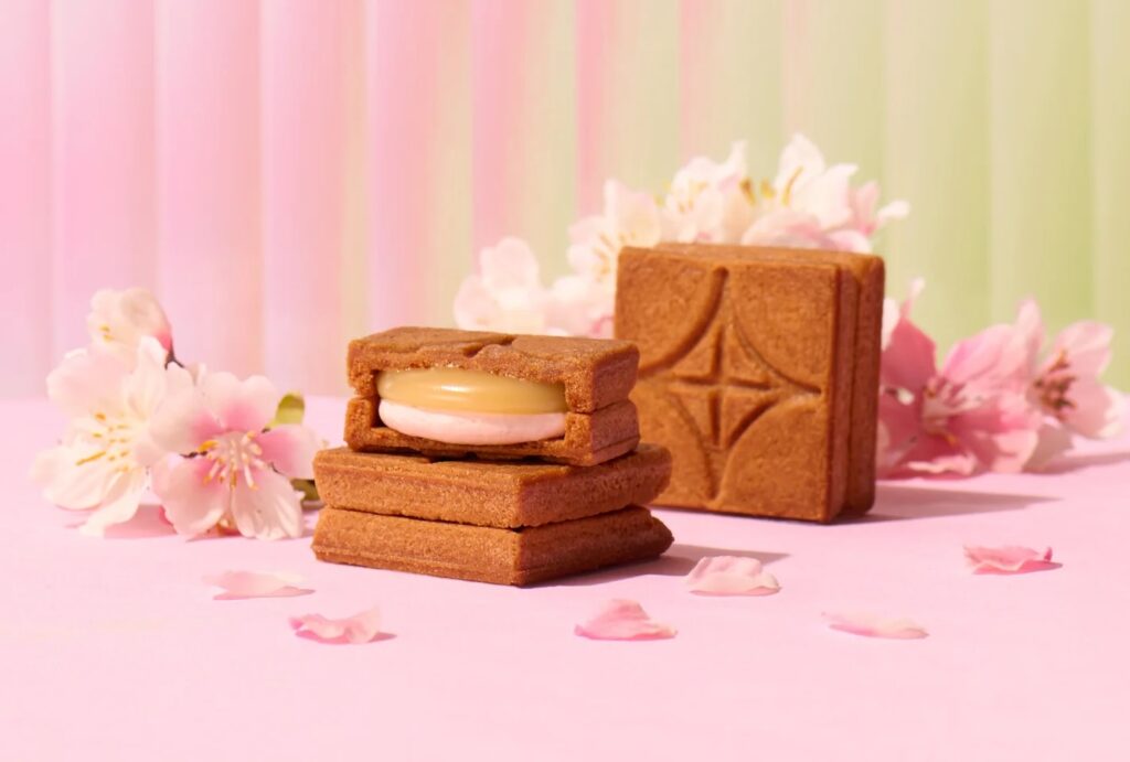 「バターサンド〈桜〉」は、桜が香るサクサク食感のクッキーの中は、桜バタークリームと定番のバターキャラメルの2層構造。ストロベリーペーストと桜パウダーを使用した桜バタークリームは、やさしい甘さとほのかな塩味が広がります。