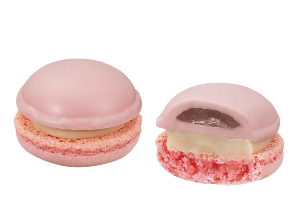 「桜&ホワイトチョコレート」は、桜の葉パウダー入りのチョコレートソースを閉じ込めたホワイトチョコレートを、桜色のマカロンとホワイトチョコレートガナッシュで挟んだ、見た目も可愛らしい一品。