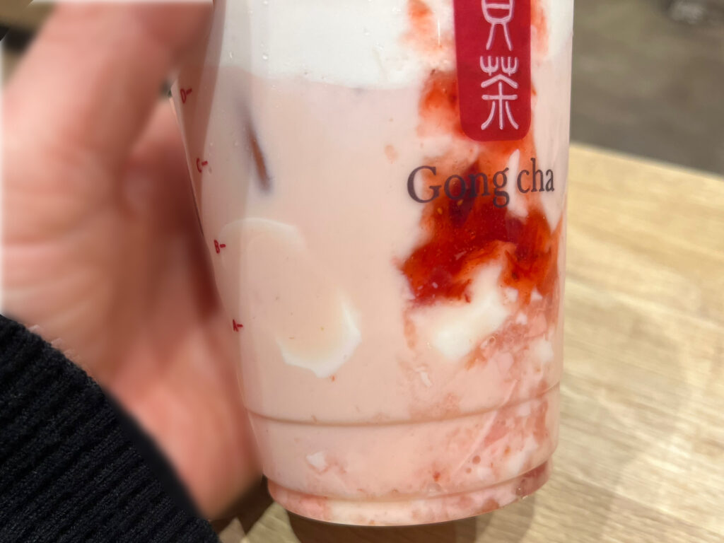 ではさっそく一口。プルンと口に杏仁豆腐が飛び込んできました!そしてイチゴ味のミルクティーが追いかけてきます。杏仁豆腐は柔らかいながらももっちもち。噛むごとに広がる杏仁豆腐ならではのコクがたまりません。