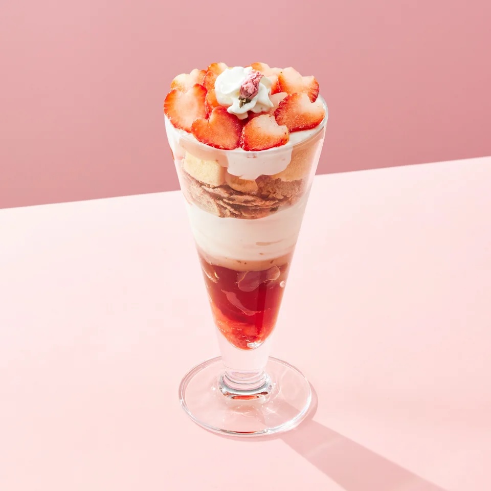 「桜の苺ショートケーキパフェ」はフレッシュな苺、ホイップクリーム、スポンジが層になり、食べ進めるごとにショートケーキのような味へと変化。さらに、桜アイスと桜あんが加わることで春らしさ満点。グラスの底には屋久島産オーガニック和紅茶ゼリーが入っており、ソフトクリームと混ざり合うことでミルクティーのような風味も楽しめます。