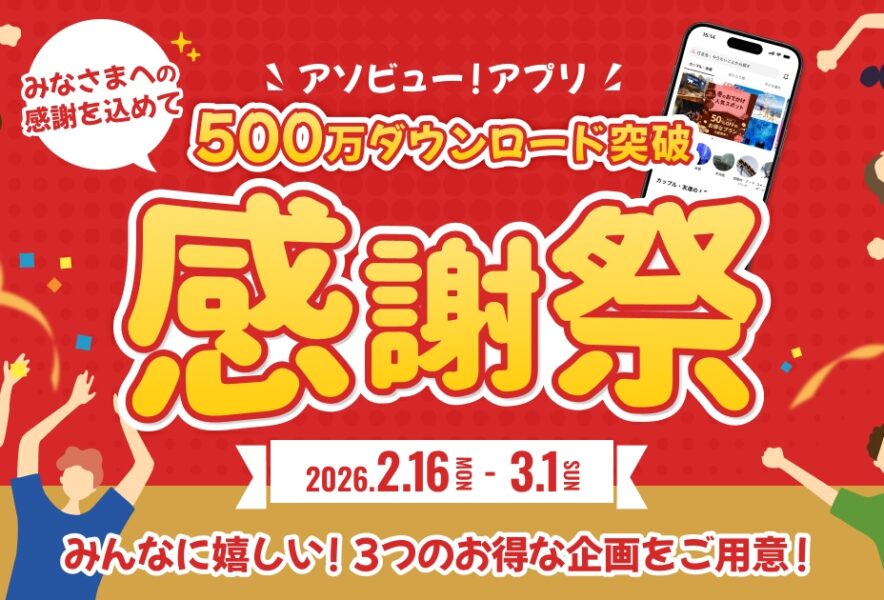 国内の遊び・体験プログラムを多彩に紹介する、週末の遊び予約サービス「アソビュー!」では、アプリが累計500万ダウンロードを突破したことを記念した『感謝祭』を開催中。2月16日(月)〜3月1日(日)の間、アプリユーザーを対象に3つのお得な特典を実施中です。気になる内容はこちら!