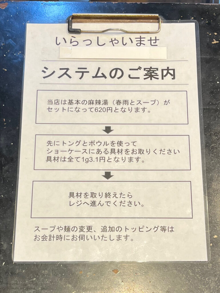 基本の麻辣湯は<春雨+スープ>で税込620円。そこへ追加した具材、1グラムにつき3.1円とのことですが、お値段はどれくらいになるのでしょうか?