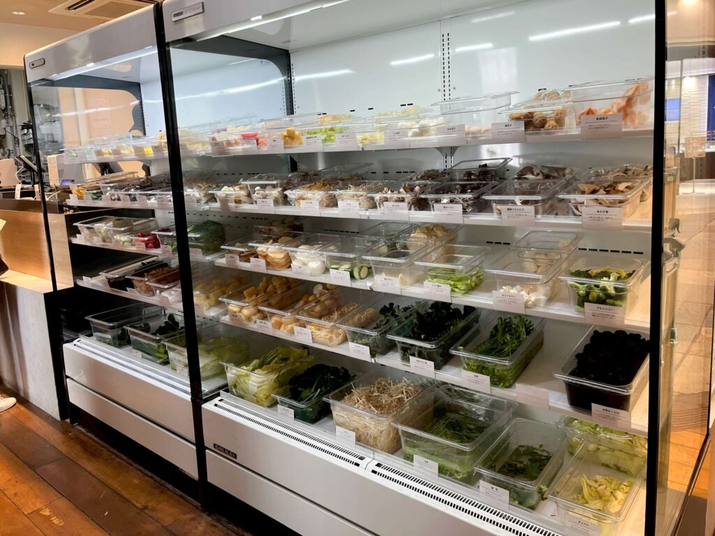 まずは席を取り、テーブルに置いてある番号札を持ってから食材の棚へ向かいます。