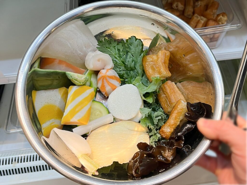 それではスープからいただきます。十数種の香辛料をオリジナルブレンドした、コラーゲンたっぷりのスープは旨みが深い!出汁だけでなく、選んだ具材から染み出た味わいも感じます。また、辛み、酸味のバランスがよく、スープだけでもどんどん飲みたくなってしまいました。