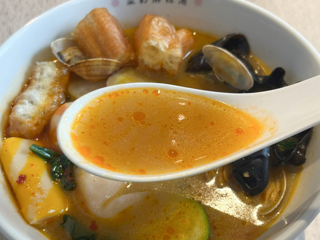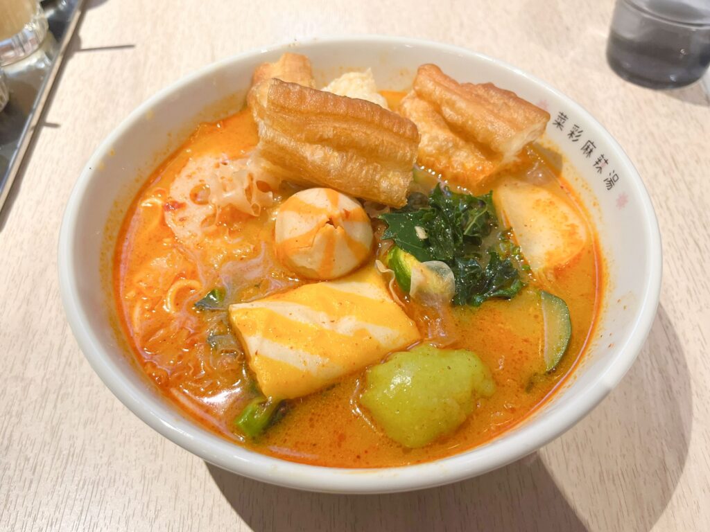 とても美味しかったので、後日また訪問。その際はスープアレンジを加えて、麻辣トムヤムスープにしてみました。こちらはエスニックな風味をしっかり感じられるスープ。
